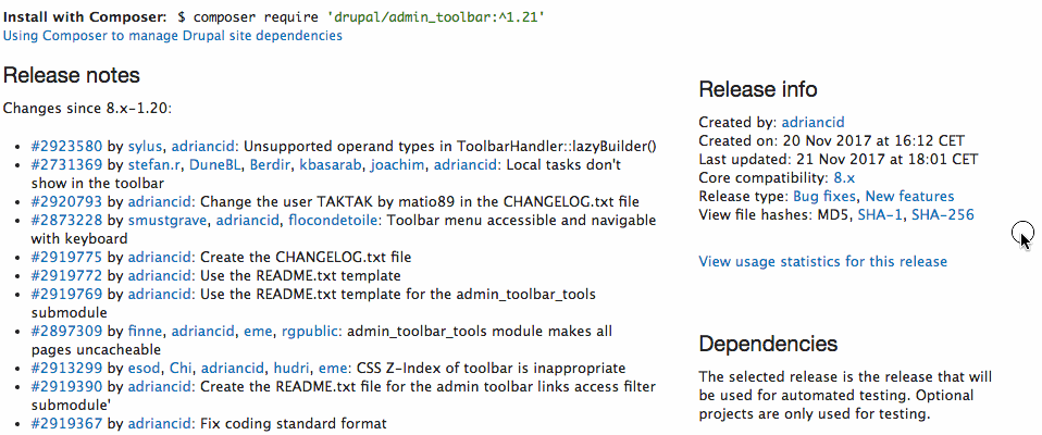 But it's not only other Github hosted projects, or generic php packages that gets updated. For a typical Drupal project I also depend on modules from Drupal.org, and I download these modules with composer. Violinist.io supports those as well. Here is one example (from this very site you are reading) where a new pull request with a full changelog was posted only 8 minutes after it was released on Drupal.org.
